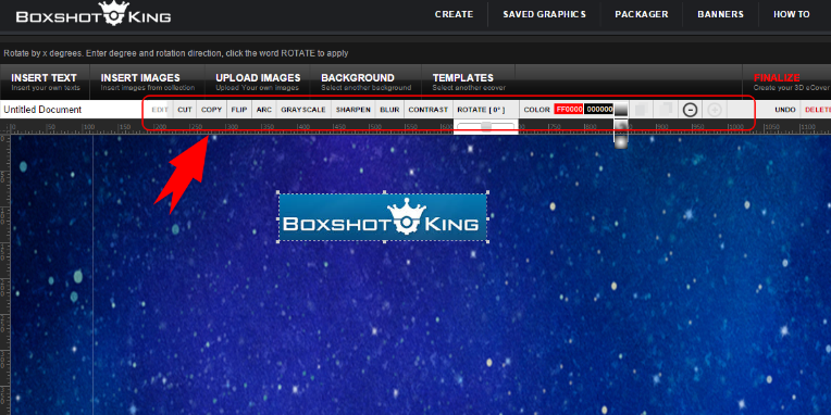 - Edit your stock image by clicking tabs at the top menu (cut, copy, flip, arc, grayscale, sharpen, blur, contrast, rotate, color).